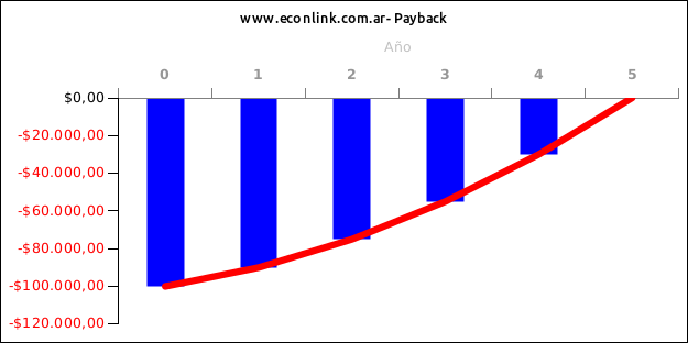 En este caso, el cálculo del Payback es muy simple: el negocio generará $100,000 en cinco años. Si el flujo de fondos fuese de $10,000 por año, el Payback sería de 10 años.